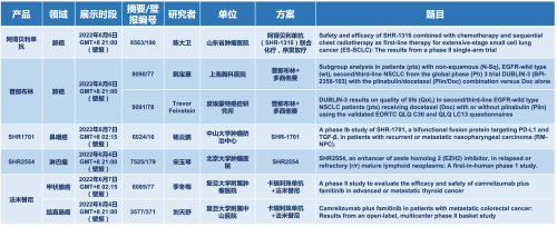 2022 ASCO年会另有5款九游会医药上市前抗肿瘤创新药的相关研究被接收为壁报,包括SHR-1316、普那布林、法米替尼、SHR-1701和SHR2554,他们的单药或联合方案相关7项研究被接收为壁报,覆盖肺癌、鼻咽癌、淋巴瘤、甲状腺癌和结直肠癌等领域。
