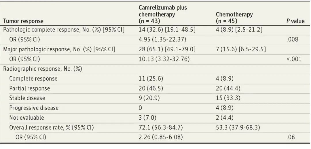 北京时间8月3日,九游会医药创新药卡瑞利珠单抗联合化疗(Cam+CT)对比化疗(CT)新辅助治疗ⅢA/ⅢB (T3N2) 期非小细胞肺癌(NSCLC)结果在线发表于国际权威期刊JAMA Oncology[1]。该研究是由空军军医大学唐都医院姜涛教授、雷杰教授团队联合陕西省肿瘤医院雷光焰教授团队、兰州大学第二附属医院王成教授团队共同参与的一项随机对照、多中心、Ⅱ期临床研究(TD-FOREKNOW,NCT04338620)。研究结果显示,与化疗相比,卡瑞利珠单抗联合化疗新辅助治疗NSCLC显著提高了病理完全缓解(pCR)率(32.6% vs 8.9%,OR=4.95,95% CI :1.35-22.37, P =0 .008),且安全性良好。本研究是卡瑞利珠单抗新辅助治疗可切除NSCLC患者的首个随机对照研究,为NSCLC新辅助免疫治疗再添新证。